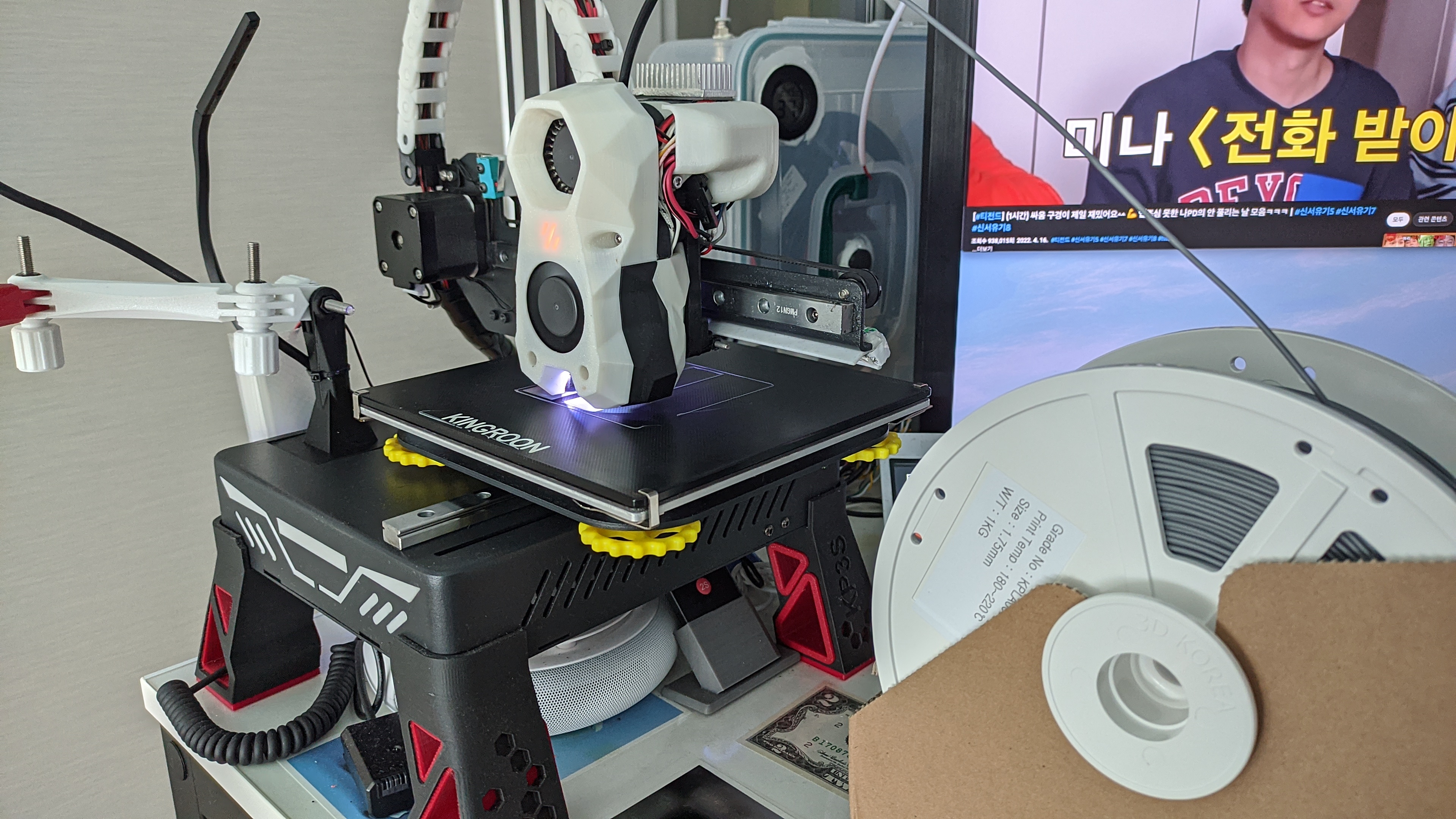 타임랩스로 출력 영상을 찍었는데 오른쪽에 이상한 것이 계속 자라는 걸 확인할 수 있습니다.